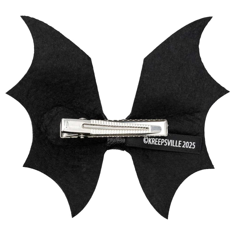 This batty bow has a batwing inspired silhoutte made with a contrast gloss and matt PVC material for fang-tastically fierce scare-cessory. Fastened with a durable metal alligator clip so you can add some crypt-chic style to any hairstyle. Clip length approx 2.35" (6cm), bow size approx 5" (12.7cm) x 4.5" (11.4cm).