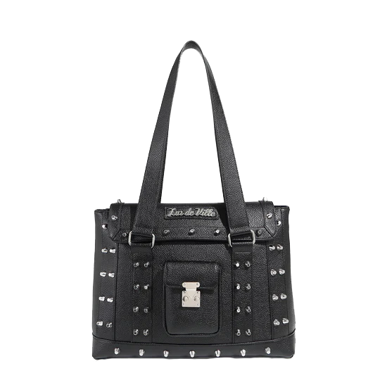 These beauties are covered in silver cone studs, front stash pocket, inside zipper closure pocket and lined in our Lux de Ville custom black on black leopard lining. Inside has a zipper closure pocket for easy stashing. As always each comes with an adjustable and detachable cross body strap and a dust ruffle bag for storage and travel.