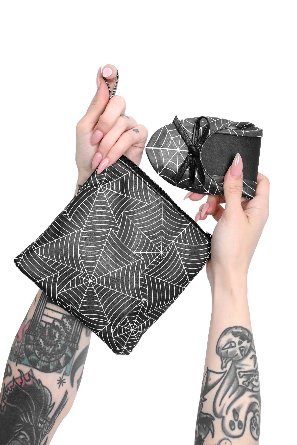 Black folding flats with an all over cobweb design, made to change out of uncomfortable shoes after a long day at a convention or even a night out at the goth club.