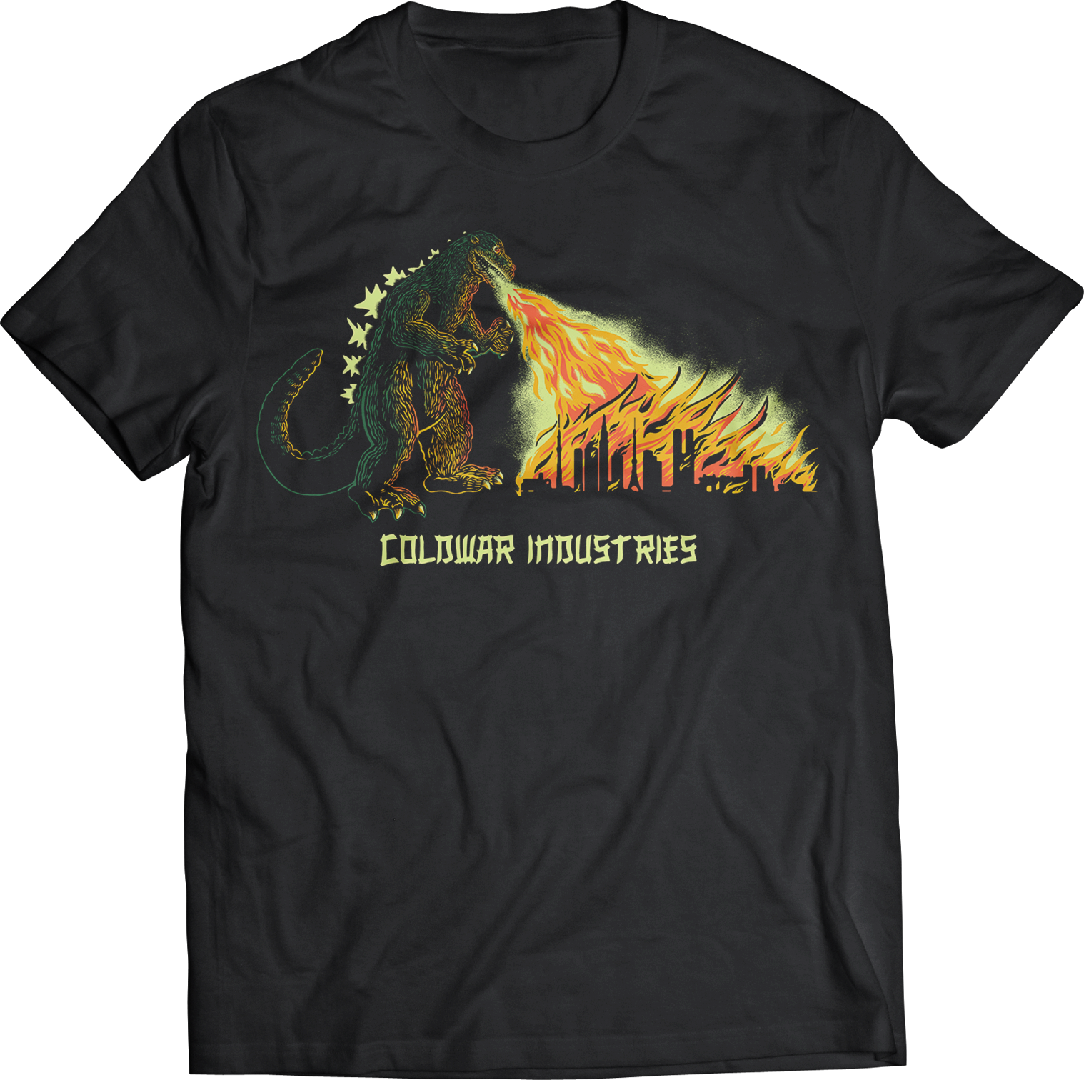 A familiar giant monster is attacking the city! Shirt features glow in the dark spines and other highlights! Our embroidered hoodies with this design were extremely popular, but we wanted to bring out even more detail so we silkscreened it on a T-shirt! Run for your lives! Silk screened with plastisol ink on a Gildan heavy cotton 6.5 weight shirt.