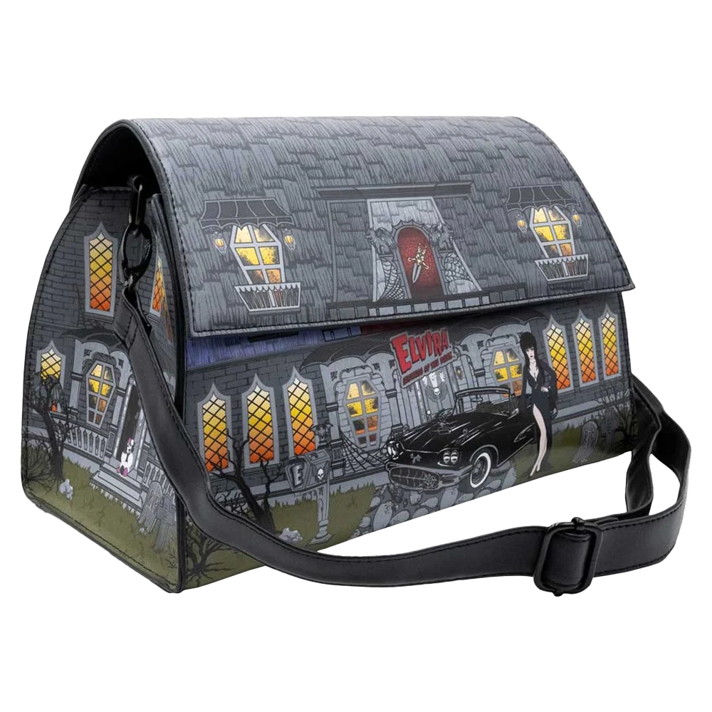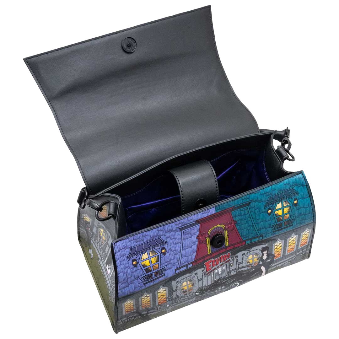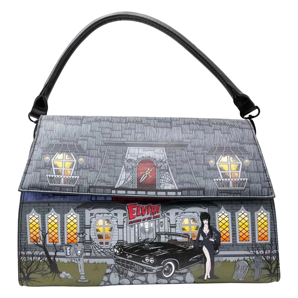 Officially licensed Elvira Haunted House Doctor's Bag. This killer purse has vintage doctor’s bag vibes with an Elvira twist featuring the horror hostess house print that makes the perfect horror home for all your eerie essentials. The structured shape keeps your potions and possessions tidy, with two quick-close magnetic clasps that make getting in and out a scream. Includes a detachable adjustable shoulder strap, detachable hand bag strap, and an inner pocket that keep your treasures from taking a final resting place at the bottom. Bag approx 11" W (28cm) x 6" L (15.2cm) x 7" H (17.8cm).
