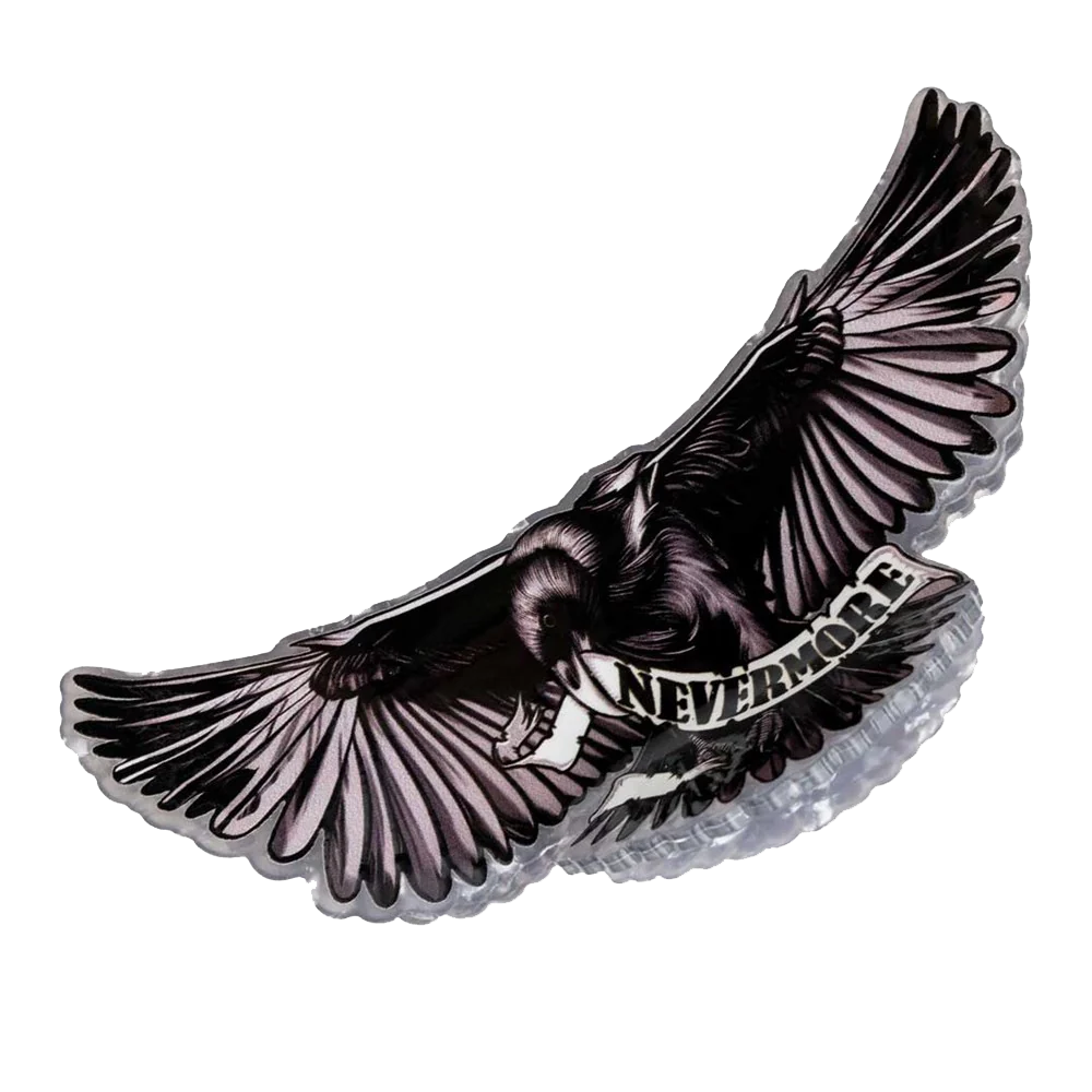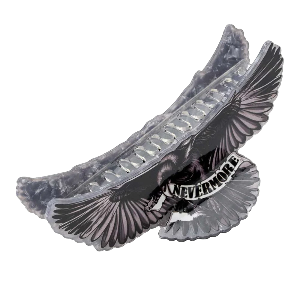 This gothic inspired hair accessory is a striking ode to Poe’s famous poem with 'nevermore' scroll on a raven shaped clip. Made from a durable acrylic with sturdy spring clip that will keep your hair in place during your nightly flight. Clip size approx: 5" (12.7cm) x 1.75" (4.5cm).