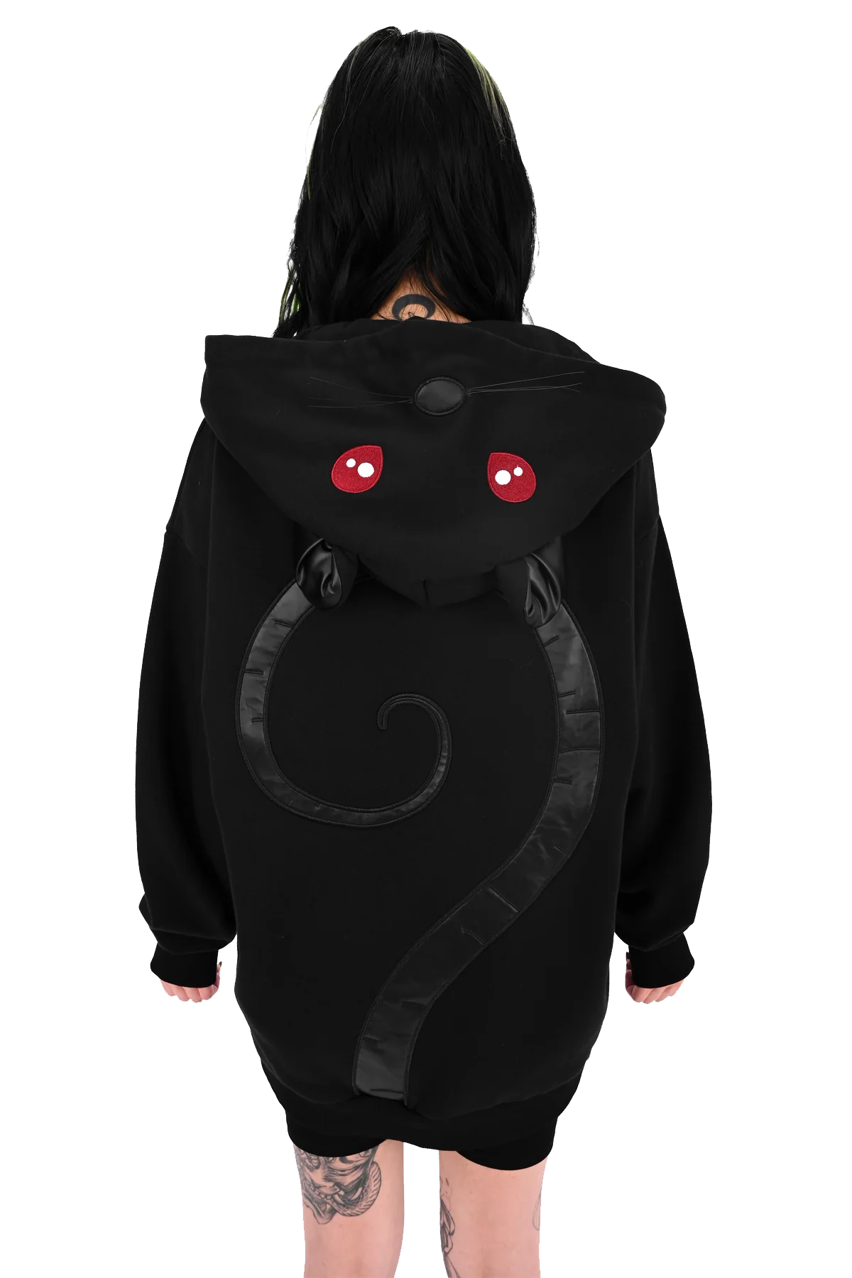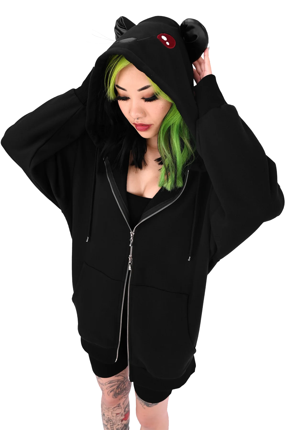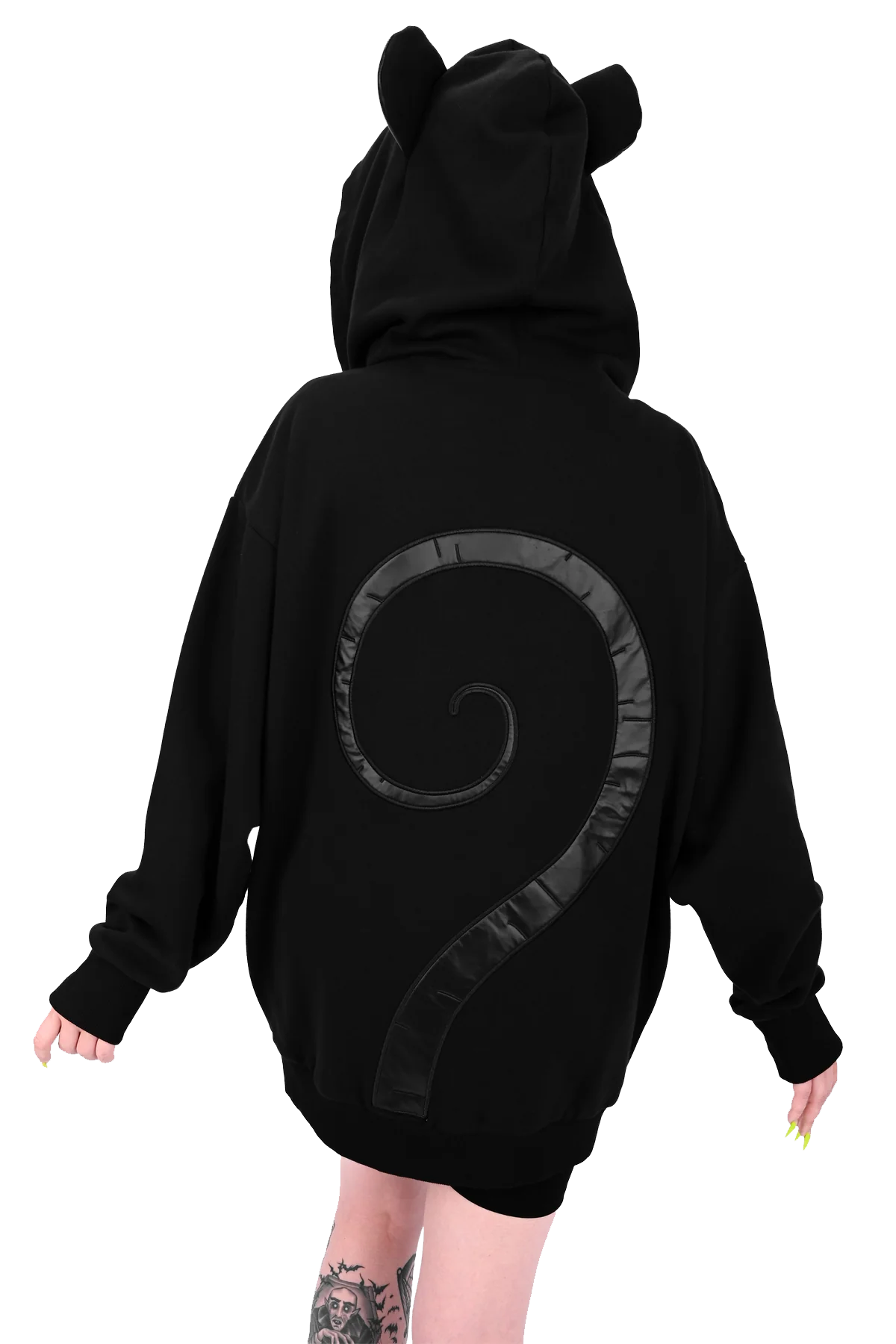 Rat face on the hood with PU ears, red eyes, a nose and little whiskers. Rat tail sewn on the back in PU and embroidery.