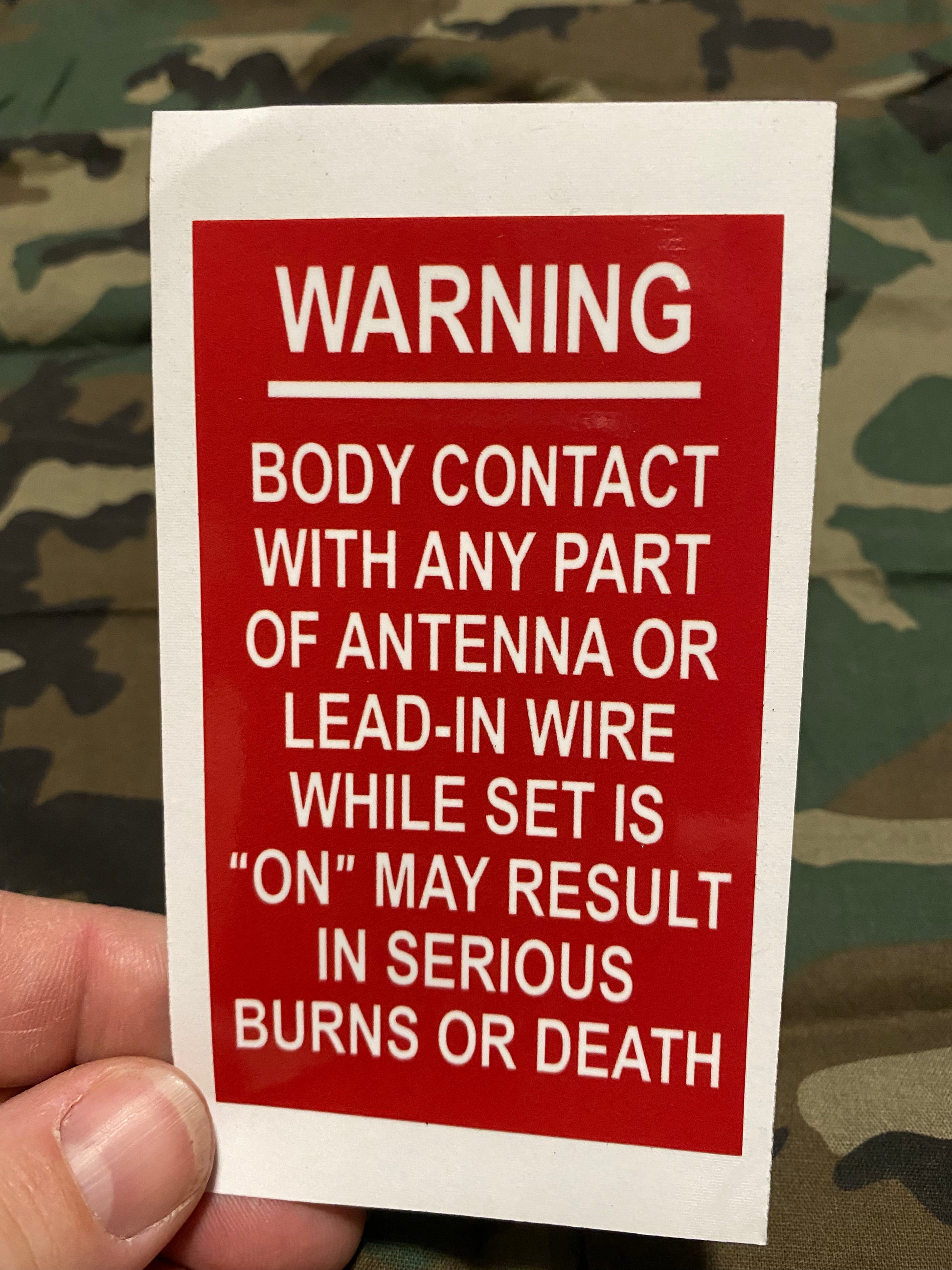 The most ominous of military decals, used in vehicles equipped with radios like the RT-524 and other sets. 70s- 90s era, but they look good on almost any antenna mounted area and help keep people from touching your rides. :)